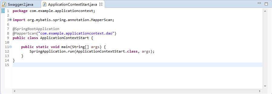 在创建spring boot项目的时候ApplicationContextStart.java是生成的,下面我们来看一下生成的java文件的内容