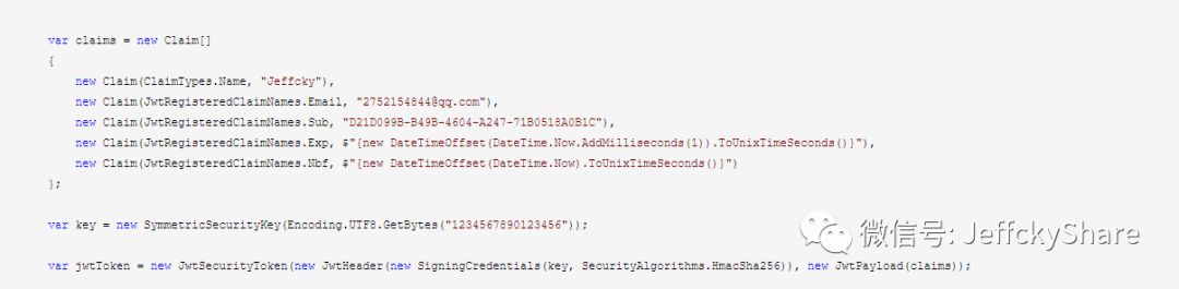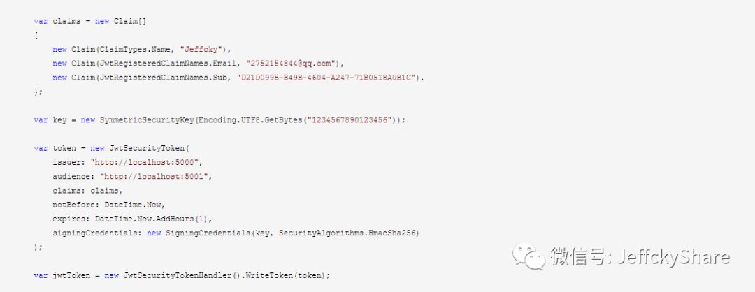 所以以上对于初始化声明两种方式的探讨并没有用哪个更好,因为对于使用ClaimTypes是沿袭以往声明映射的方式,如果要出于兼容性考虑,可以结合两种声明映射方式来使用。接下来我们来看生成签名代码,生成签名是如下代码: