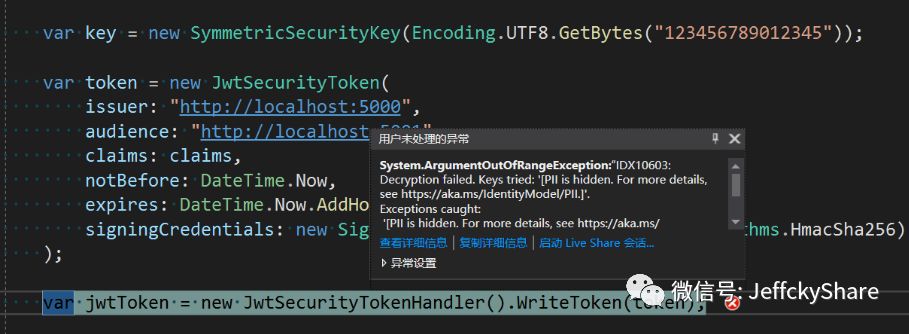 如上我们给出签名的Key是1234567890123456,是不是给定Key的任意长度皆可呢,显然不是,关于Key的长度至少是16,否则会抛出如下错误