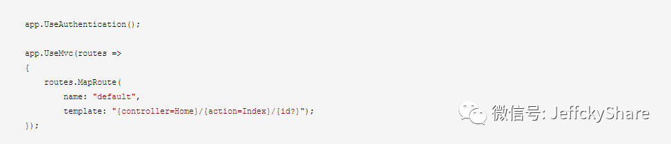 最后别忘记添加认证中间件在Configure方法中,认证中间件必须放在使用MVC中间件之前,如下: