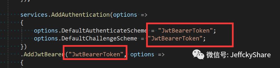 如上对于认证方案我们使用的是 JwtBearerDefaults.AuthenticationScheme 即Bearer,除此之外我们也可以自定义认证方案名称,如下: