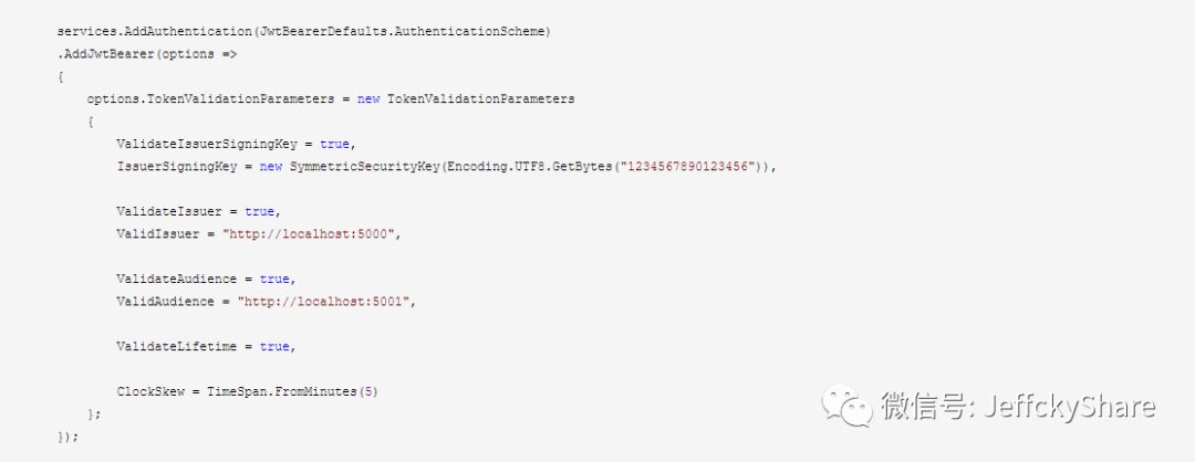 如上述若Token依赖于第三方而创建,此时必然会配置issuer和audience,同时在我方也如上必须验证issuer和audience,上述我们也验证了签名,我们通过设置ValidateLifetime为true,说明验证过期时间而并非Token中的值,最后设置 ClockSkew 有效期为5分钟。对于设置 ClockSkew 除了如上方式外,还可如下设置默认也是5分钟。