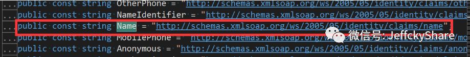如上我们在声明集合中初始化声明时,我们使用了两种方式,一个是使用ClaimTypes,一个是 JwtRegisteredClaimNames ,那么这二者有什么区别?以及我们到底应该使用哪种方式更好?或者说两种方式都使用是否有问题呢?针对ClaimTypes则来自命名空间System.Security.Claims ,而JwtRegisteredClaimNames则来自命名空间System.IdentityModel.Tokens.Jwt ,二者在获取声明方式上是不同的,ClaimTypes是沿袭微软提供获取声明的方式,比如我们要在控制器Action方法上获取上述ClaimTypes.Name的值,此时我们需要F12查看Name的常量定义值是多少,如下: