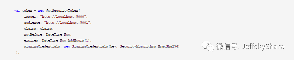 issuer代表颁发Token的Web应用程序,audience是Token的受理者,如果是依赖第三方来创建Token,这两个参数肯定必须要指定,因为第三方本就不受信任,如此设置这两个参数后,我们可验证这两个参数。要是我们完全不关心这两个参数,可直接使用JwtSecurityToken的构造函数来创建Token,如下:
