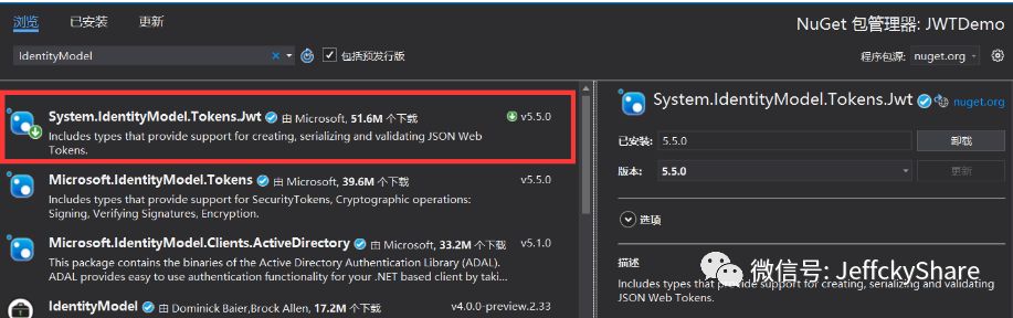 在.NET Core中如何使用JWT,那么我们必须得知晓如何创建JWT,接下来我们首先创建一个端口号为5000的APi,创建JWT,然后我们需要安装 System.IdentityModel.Tokens.Jwt 包,如下: