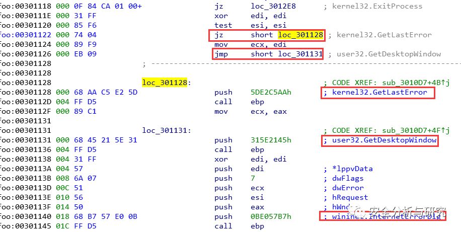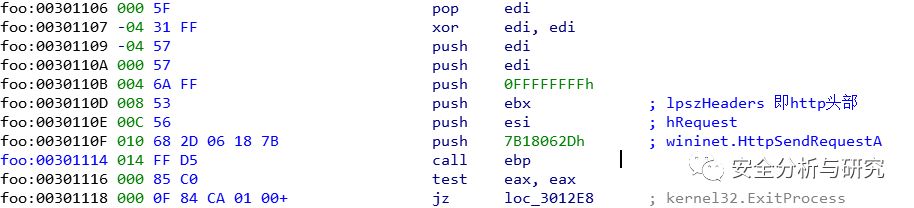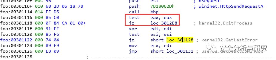 继续往下看,调用完HttpSendRequestA后,会判断返回是否为0(False)。