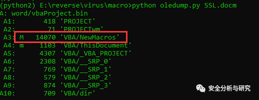 oledump.py是一个用于分析OLE文件(复合文件二进制格式)的程序,而word、excel、ppt等文档是OLE格式文件的,可以用它来提取宏代码。