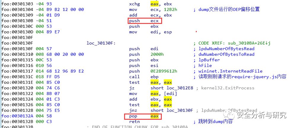 然后调用InternetReadFile读取require-jquery.js内容,保存在刚分配的虚拟内存空间里。每次读取2000h字节,循环直到全部读取完。