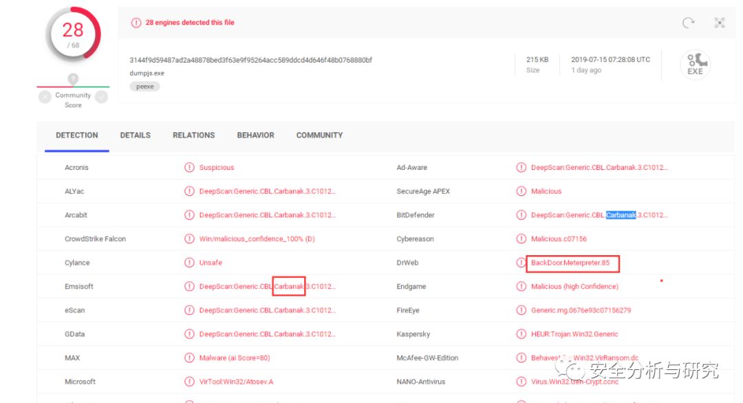 这次先讲到这段shellcode分析,因为另一段有200多K,后面找时间分析。上传virustotal,检测该段shellcode可能为一个后门木马,用来连接C&C服务器,而目标IP端口与上面的shellcode一致。