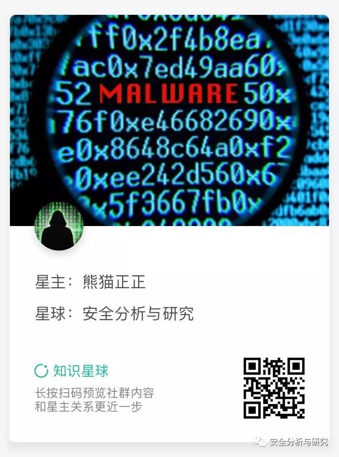 更多精彩内容,可加入知识星球,安全分析与研究,跟一些业界顶尖大牛一起交流学习,在知识星球跟熊猫正正一起学习安全知识,专注于安全分析与研究,分享各种安全纯干货!1.各类恶意样本分析技术,不限平台,包含:勒索病毒、挖矿病毒、蠕虫病毒,感染型病毒、僵尸网络、APT攻击、盗号木马、后门,以及各种硬件木马后门等!2.二进制常见漏洞分析与实战!3.应急响应、渗透测试、黑产追踪、威胁情报、最新热点安全事件剖析!
