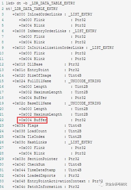 4.LDR包含了三个LIST_ENTRY结构体,本质是一样的只是以不同次序将_LDR_DATA_TABLE_ENTRY项链接在一起。LDR偏移0x14为InMemoryOrderModuleList。