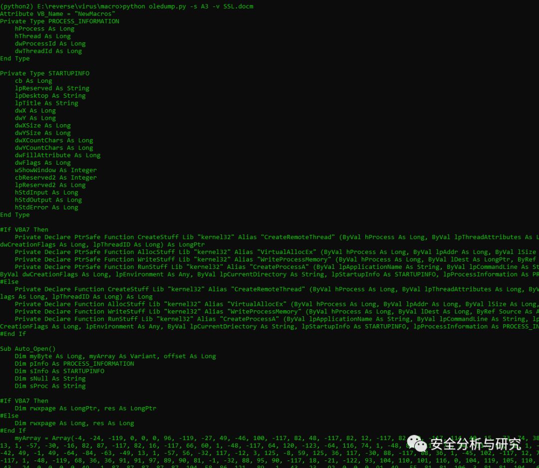 接下来我们就需要将这段VBA代码提取出来,执行以下命令,可以看到VBA代码就被提取出来了。我们把他重定向到一个文件里即可。