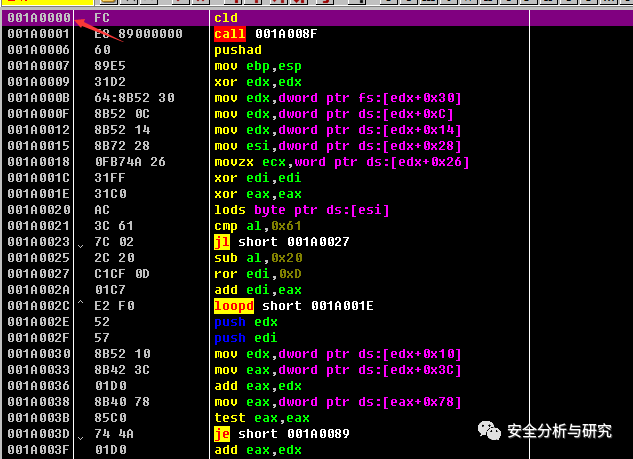 解密看了下开头部分的反汇编,通过hash来找API的操作也与分析的shellcode类似。