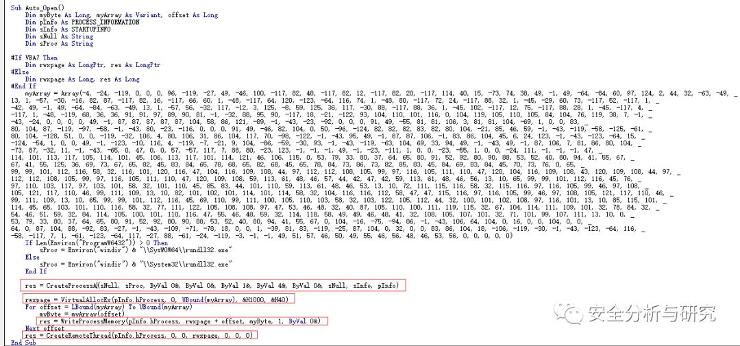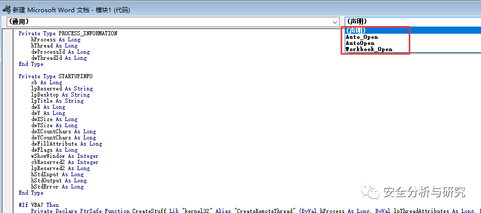 我们先粗略的看下代码结构,包括声明和几个Open代码段,Auto_Open表示用户打开文档时,会自动执行该段代码,而用户一无所知。