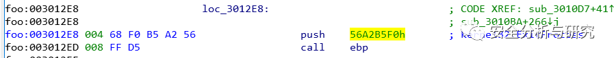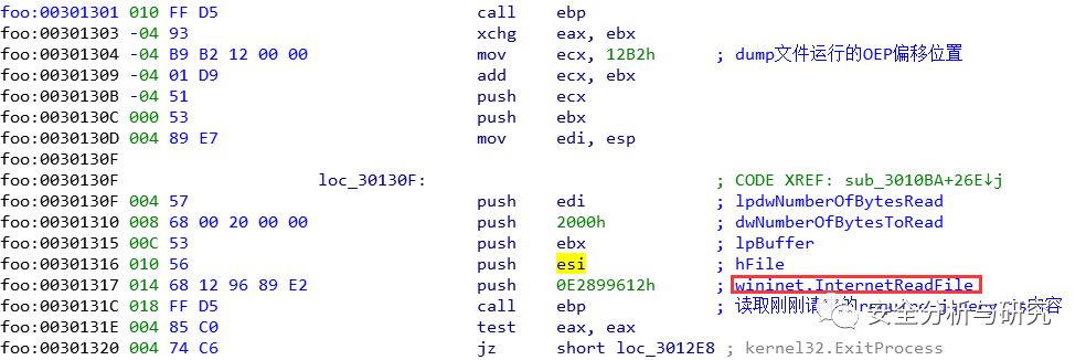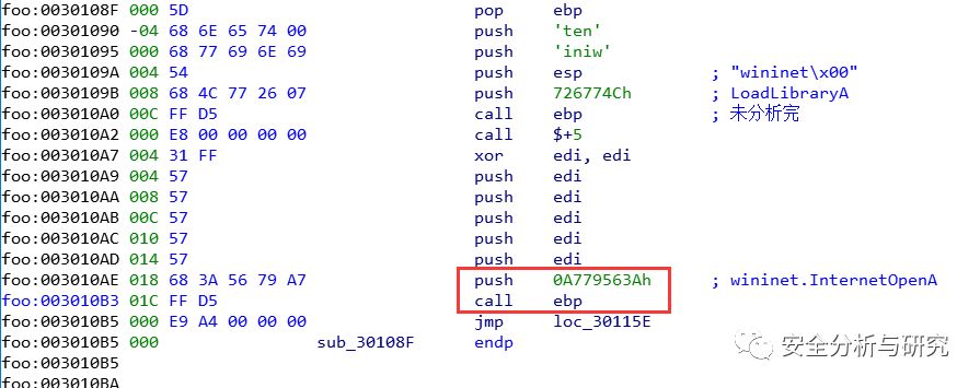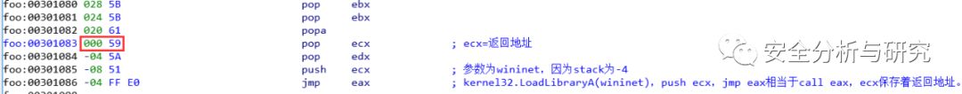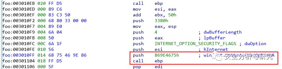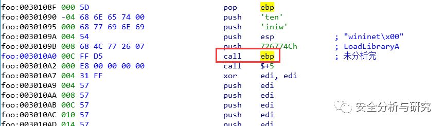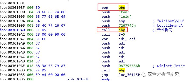 进入该函数后,可以看到pop ebp,将call压栈的下一条指令地址(这里为0x301006)存入ebp。然后通过call ebp,来调用0x301006开始的函数,在call调用前,可以看到几句push,猜测传递了两个参数,一个8位16进制,一个字符串参数,这个在图中看到的是大端显示,转换为小端显示即“wininet”。