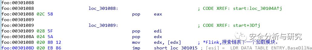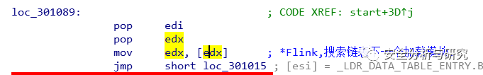 其中jz指令,用来判断当前模块是否存在导出表,如果不能存在就查找双向链表的Flink指向的下一个模块的LIST_ENTRY,从Loc_301015处重新循环。
