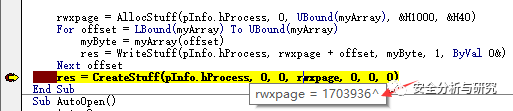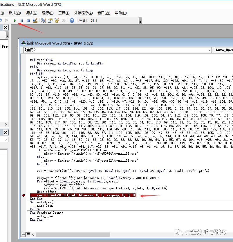 在VBA的CreateRemoteThread设下断点,点击运行,让VBA中断在这里,这个时候已经成功进行运行rundll32并进行shellcode注入,只差线程创建运行了。