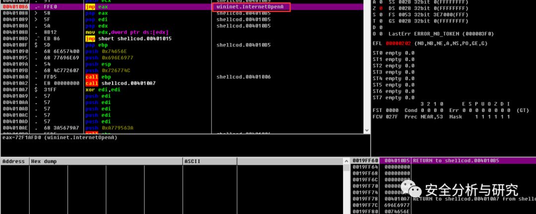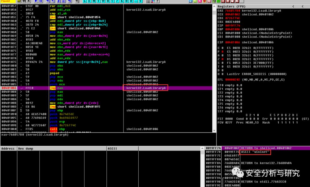 可以看到这里其实是通过LoadLibraryA来加载wininet,这个dll是用来进行网络传输的,说明该shellocde可能存在网络通信行为。