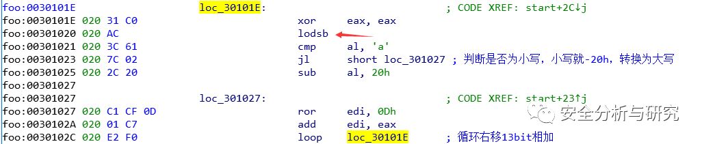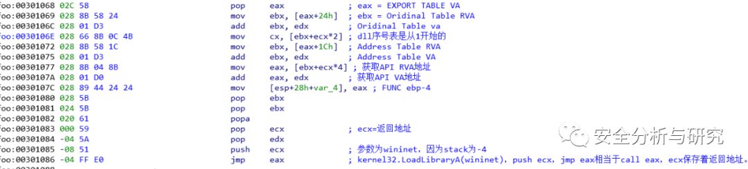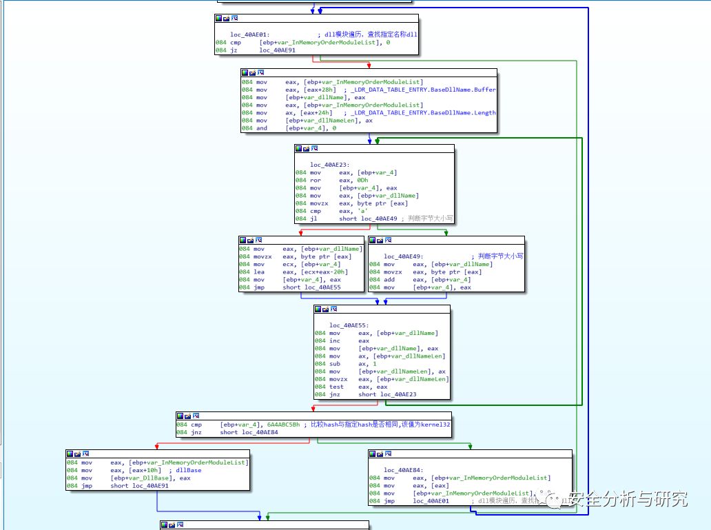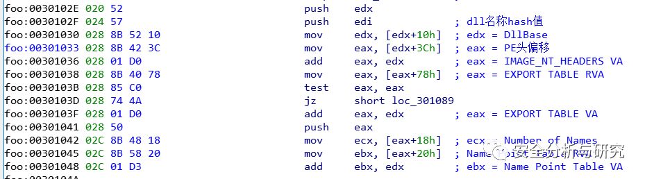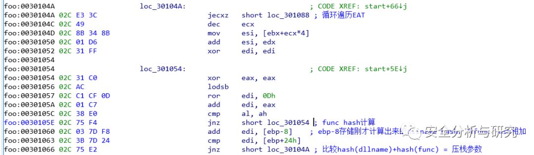 获取了dll的Name Point Table后,通过loc_30104A遍历func name,每次循环通过loc_301054计算func name的hash值,将其和dllname的hash值相加,与call指令之前压栈的8位16进制相比。即判断hash(dllname)+hash(func) = 压栈参数。