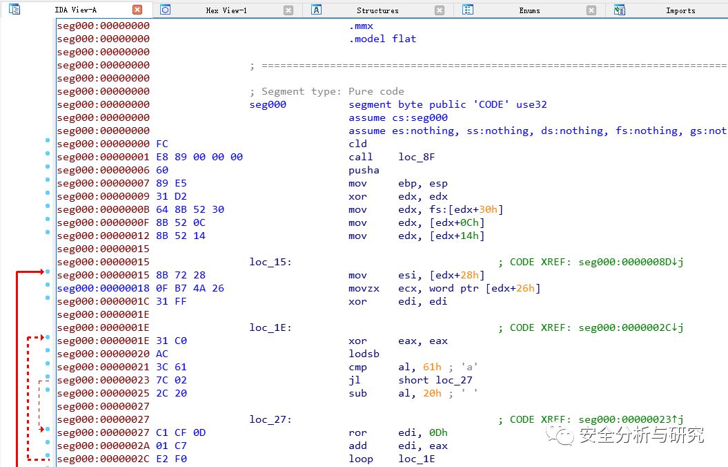 这里使用了散列算法来计算name的散列值,通过循环,使用lodsb按字节将name从esi存储在eax里,转换成大写,将当前edi中的32位散列值循环右移13位,并将当前eax字节加到这个散列中。(shellcode中的这种算法被列入metasploit,已经成为普遍使用的算法)