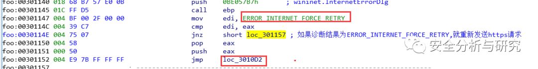 根据InternetErrorDlg的返回值是否为ERROR_INTERNET_FORCE_RETRY判断是否需要重传,如果需要重传,就重新执行上面HttpOpenRequest等一系列操作,如下所示: