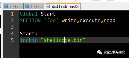 编写一个简单的汇编,设置一个foo段,然后导入shellcode.bin的二进制文件。