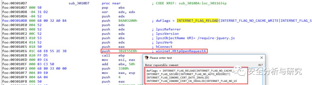 继续跟踪,会发现还调用了HttpOpenRequestA来设置URI,URI为/require-jquery.js,并且flag字段设置了INTERNET_FLAG_SECURE,表明建立的是https链接,INTERNET_FLAG_IGNORE_CERT_DATE_INVALID|