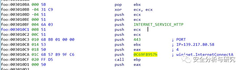继续跟下来,会经过两个jmp和一个call调用,然后到达以下位置,根据OD调试,这里是调用wininet.InternetConnectA,设置和139.217.80.58需要建立一个443端口的http连接。