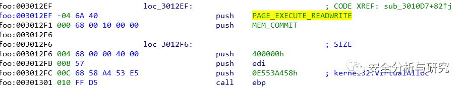 否则就跳转到loc_301157,调用VirtualAlloc分配一段虚拟内存,大小为400000h,可读写执行。