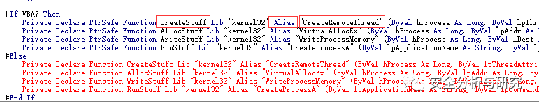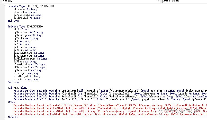 回过头我们先看下声明的内容,首先是定义了两个两个结构体,然后声明了几个dll的导出函数的引用,判断是否为VBA7版本,使用不同的语法引用。