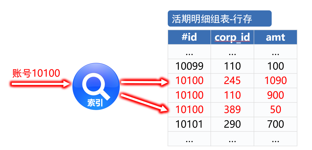 查询账户 10100,先利用内存中预先加载的多级索引和索引文件,快速定位到活期明细数据文件中的位置,再连续读取到账户 id 有变化为止。因为数据是按照账户 id 物理有序的,所以文件的其他位置不可能再有 10100 账户的数据了。