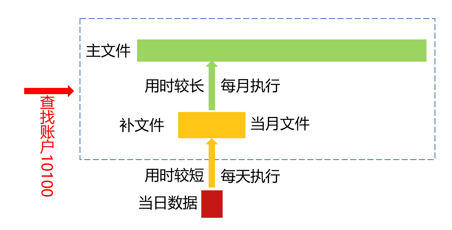 活期明细存款是按账号有序的,并不是按日期有序。所以,不能在末尾追加当日新增数据。活期明细几十亿条,如果每天有序归并新数据的话,耗时太长。每月归并一次的方案比较理想。如果将活期明细数据看成是主文件,那么更新原理如下图: