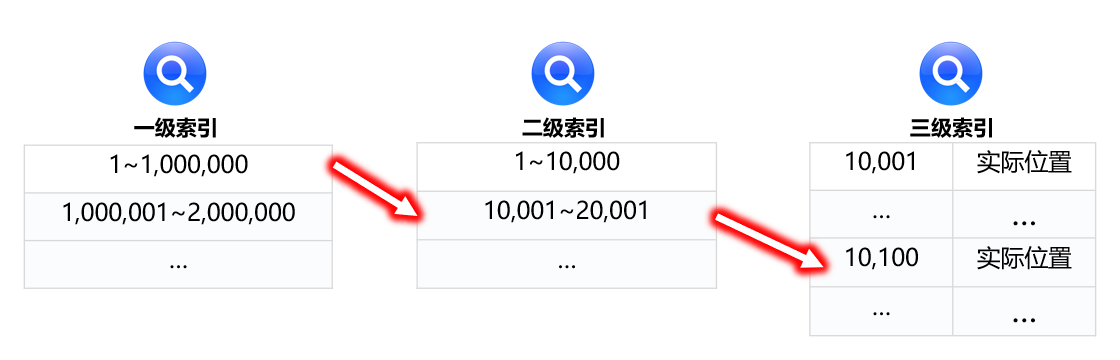要利用索引提速,先要对明细文件建立索引。由于明细数据量大,建立的索引文件也会很大。很难全部加载到内存中。可以建立多级索引,如下图: