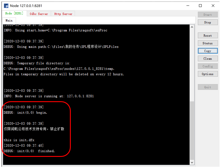 这段预先加载的初始化代码(代码示例 3),可以保存成 init.dfx,放入集算器主目录(main path),在节点机(unitServer)启动的时候会自动被调用,如下图: