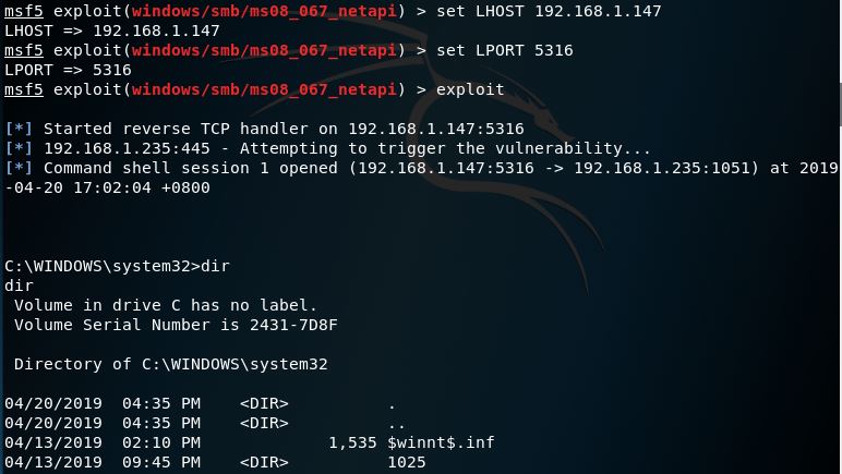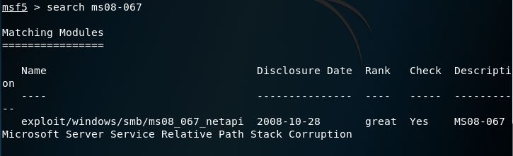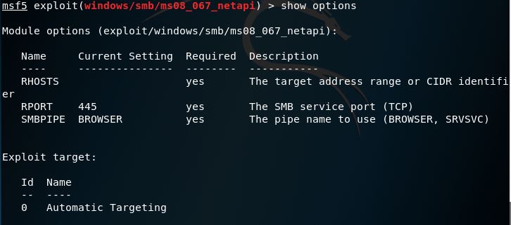 use exploit/windows/smb/ms08_067_netapi 选择该漏洞