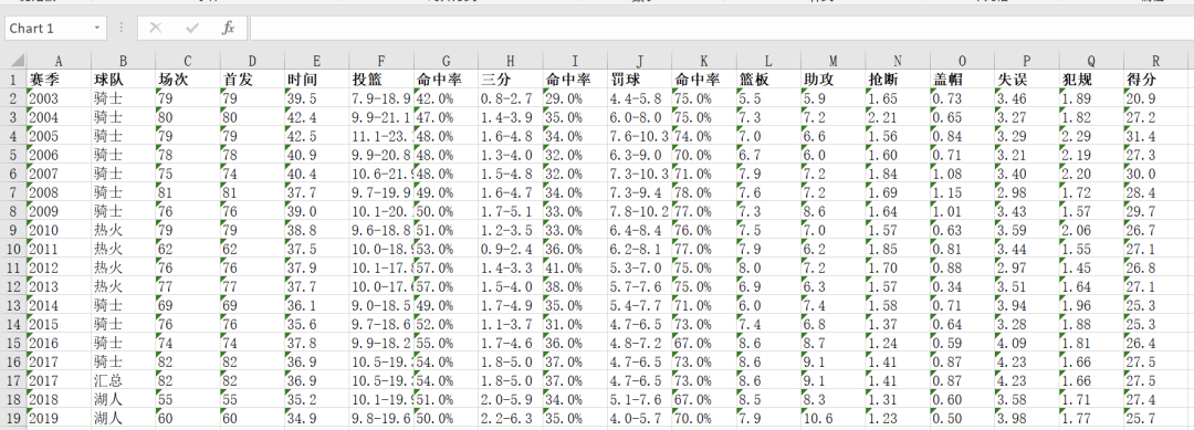 数据表格效果展现,以詹姆斯为例如下