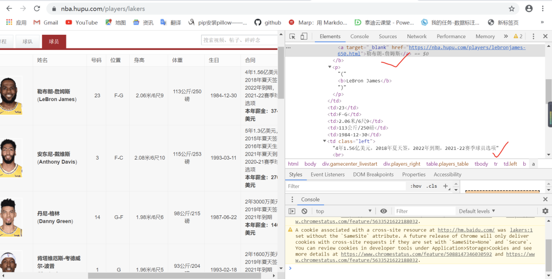 现在就此得到了对应球队的URL3,接着观察URL3网页的内容,可以看到球员基本信息在标签p下,球员常规赛生涯数据与季后赛生涯数据在标签td下,如下图: