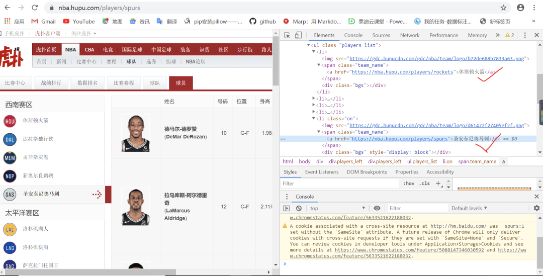 就此得到了对应球队的URL2,接着观察URL2网页的内容,可以看到球员名称在标签a中<a target = "_blank" href = ....>下,同时也存放着对应球员的URL3,如下图: