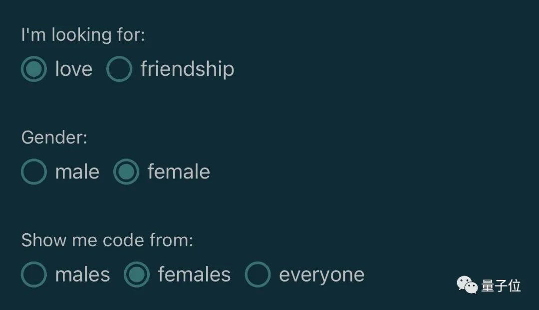 VSinder也考虑到性取向问题,你也可以选择约会对象的性别。又或者是你只想找个一起交流代码的同性朋友,只需在程序中选择friendship。