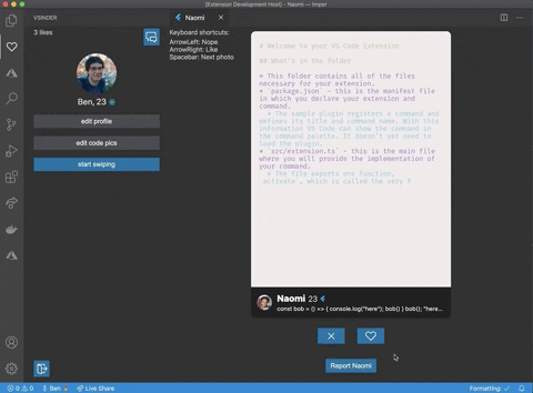 顾名思义,VSinder = VS Code + Tinder,就是把约会软件集成到了代码编辑器里,简直太对程序员胃口了。
