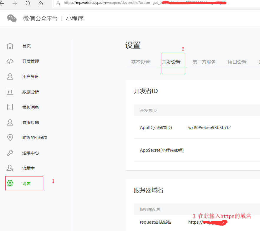 有了证书,还不够,还应该登录微信小程序的管理后台 进行如下图操作: