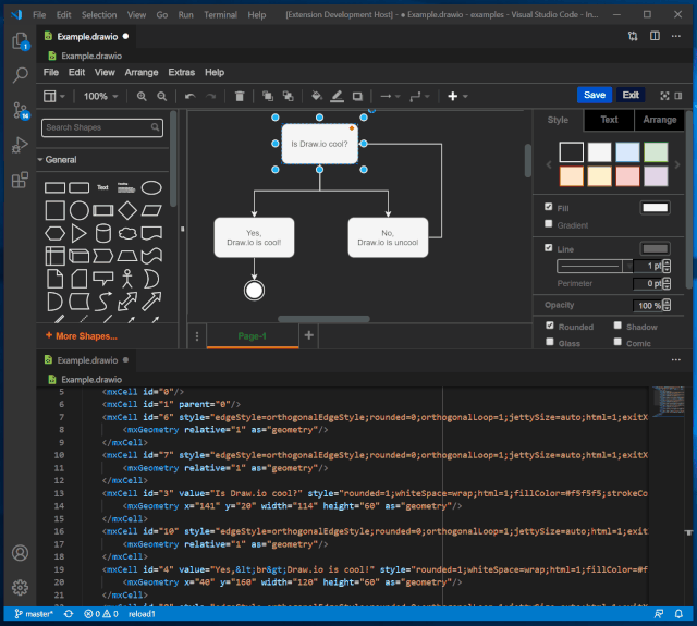 在作者 Henning Dieterichs 的辛苦努力下,VSCode 现已完美集成 drwa.io,用户只需点点鼠标,安装下插件,便能立即在 VSCode 上体验 draw.io 的所有核心功能。