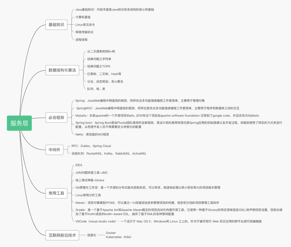 Tip:请多欣赏一会,每个点看一下,看看什么地方是你接触过的,什么技术栈是你不太熟悉的,我觉得还算是比较全的,有什么建议也可以留言给我。