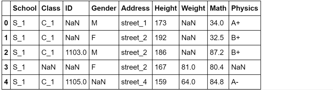 import pandas as pdimport numpy as npdf = pd.read_csv('data/table_missing.csv')df.head()