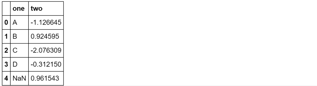 df_g = pd.DataFrame({'one':['A','B','C','D',np.nan],'two':np.random.randn(5)})df_g