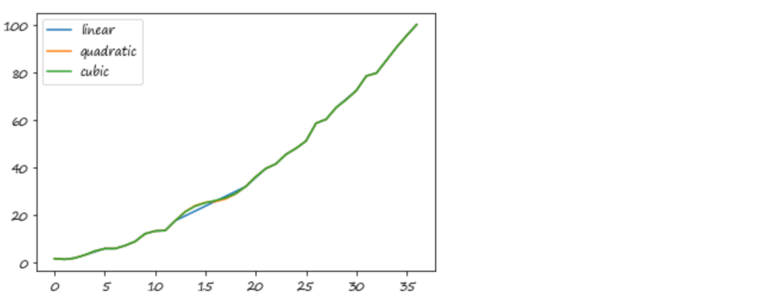 ser = pd.Series(np.arange(1, 10.1, .25) ** 2 + np.random.randn(37))missing = np.array([4, 13, 14, 15, 16, 17, 18, 20, 29])ser[missing] = np.nanmethods = ['linear', 'quadratic', 'cubic']df = pd.DataFrame({m: ser.interpolate(method=m) for m in methods})df.plot()<matplotlib.axes._subplots.AxesSubplot at 0x7fe7dc86f810>