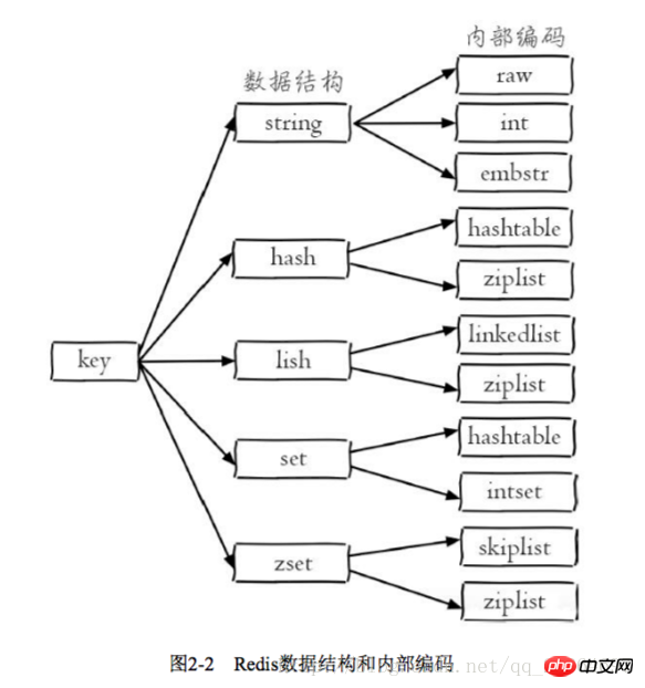 每种数据结构都有两种以上的内部编码实现,例如list数据结构包含了linkedlist和ziplist两种内部编码,可以通过object encoding命令查询内部编码