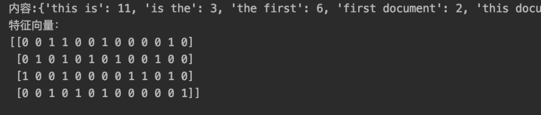 from sklearn.feature_extraction.text import CountVectorizercount = CountVectorizer()doc = np.array(['This is the first document.','This document is the second document.','And this is the third one.','Is this the first document?'])bag = count.fit_transform(doc)#{'this': 8, 'is': 3, 'the': 6, 'first': 2, 'document': 1, 'second': 5, 'and': 0, 'third': 7, 'one': 4}# 字典形式呈现,key:词,value:特征索引print('内容:%s'%count.vocabulary_)print('特征向量:')print(bag.toarray())