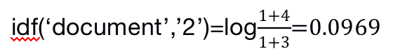 在文档2中,单词document的词频为2(tf=2),由于document在三个文档中出现过,所以它的文档频率为3(df=3)。所以我们可以得到关于document的idf: